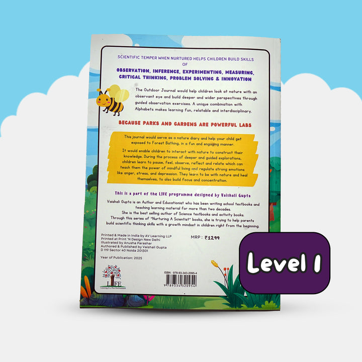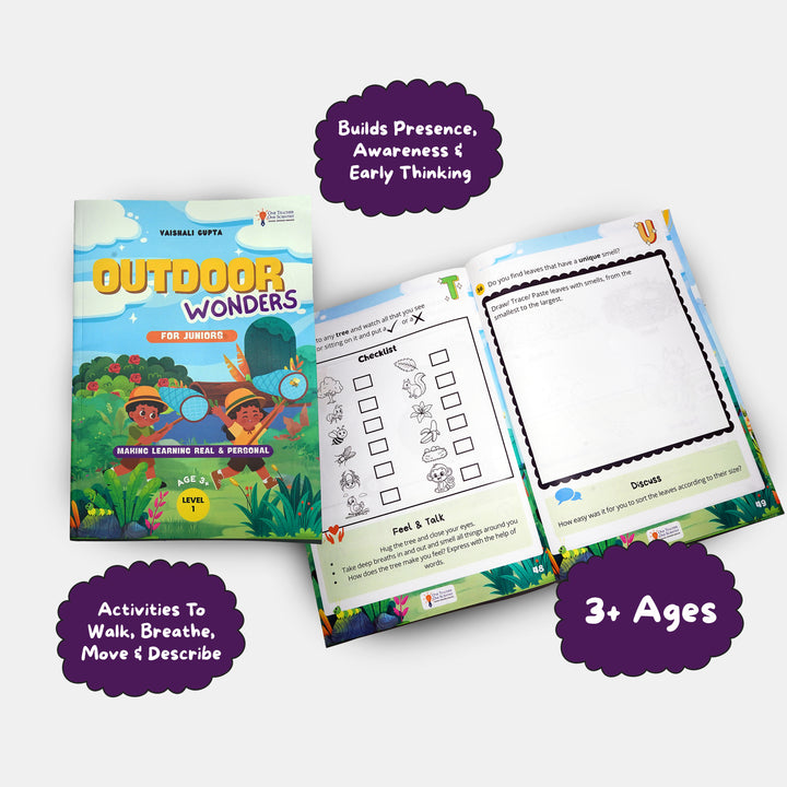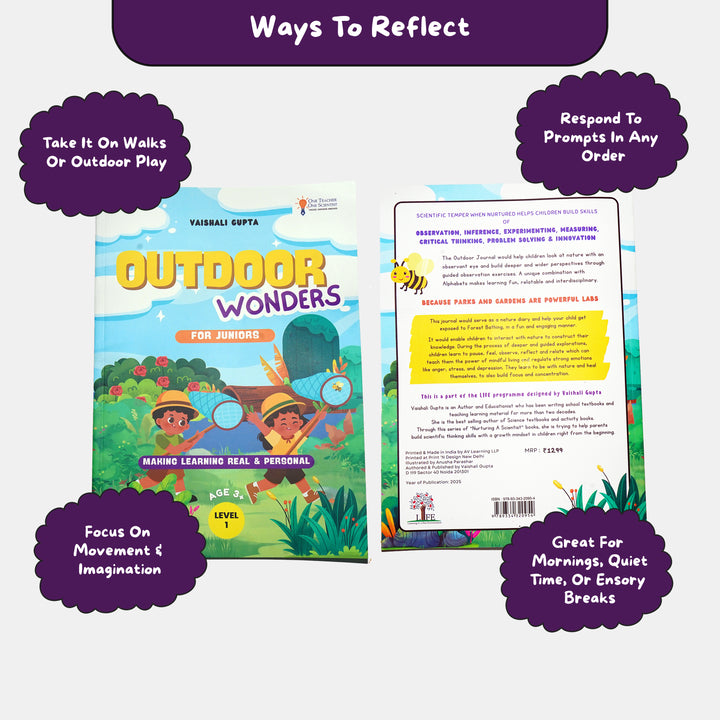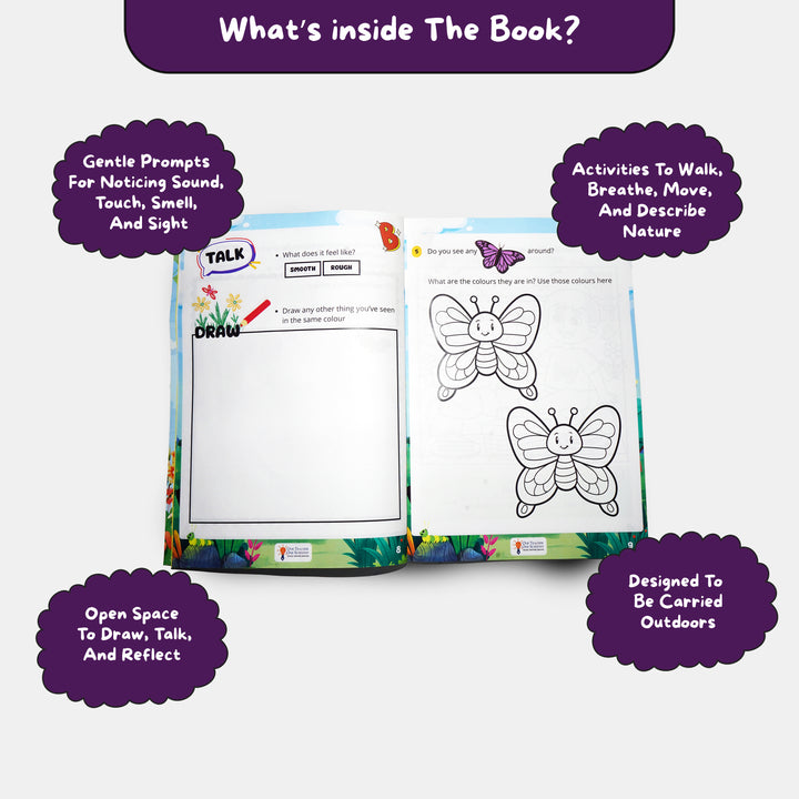 An open-ended outdoor activity book that invites young children to explore nature using their five senses. With space to observe, move, speak, and draw — this book builds presence, awareness, and early thinking skills through joyful outdoor play.