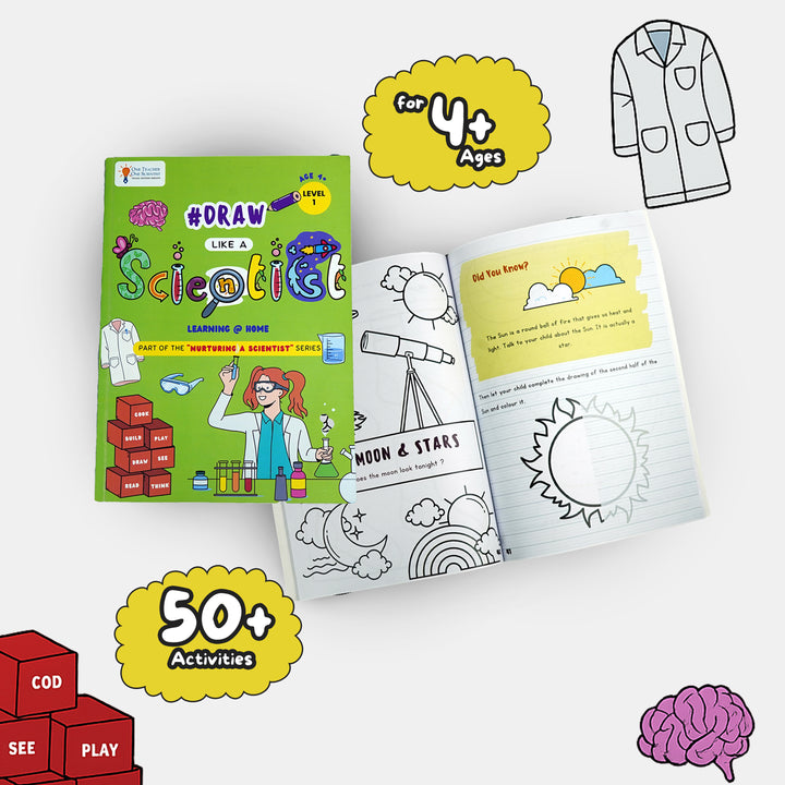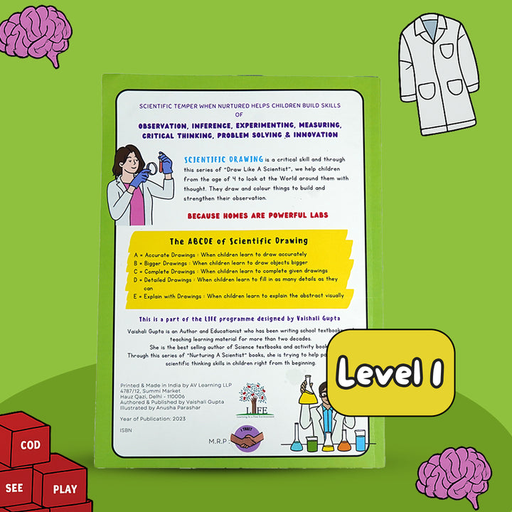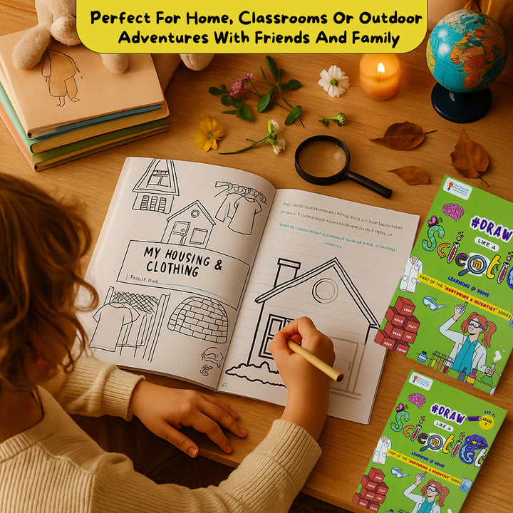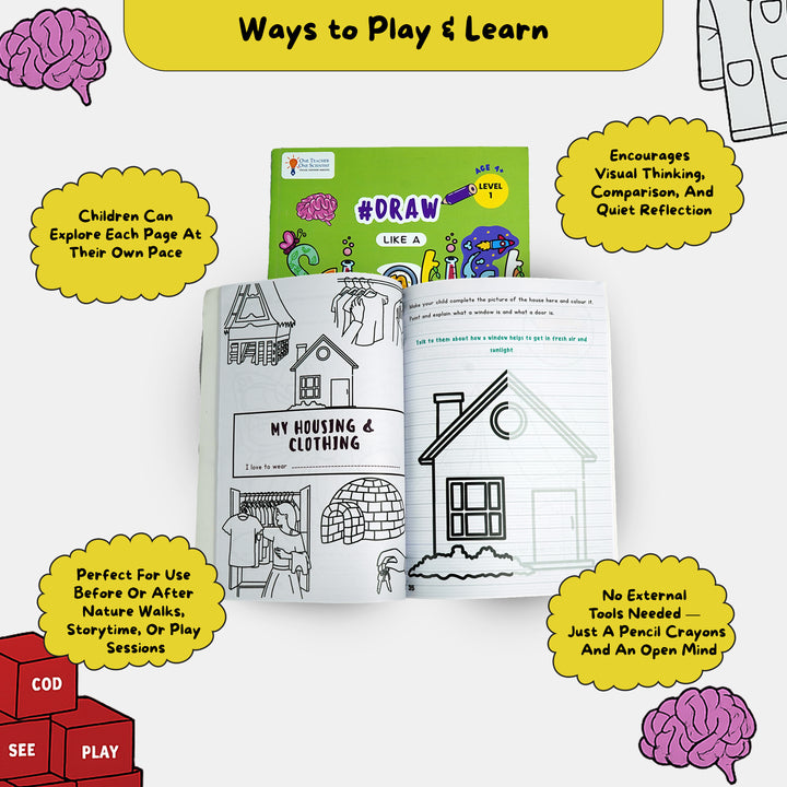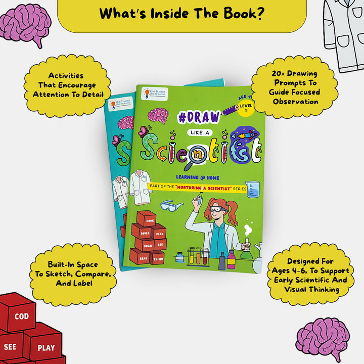 A guided drawing book that helps young children observe like scientists. Through simple prompts and sketching exercises, children learn to slow down, notice details, and express what they see with clarity and curiosity.